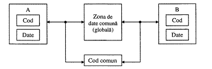 Se bazeaza pe existenta unei zone de date utilizata in comun (figura 5.5). Modulele implicate in comunicatie trebuie sa 'cunoasca' structure acelei zone, iar informative din module, referitoare la acea zona de memorie, trebuie sa fie compatibile.