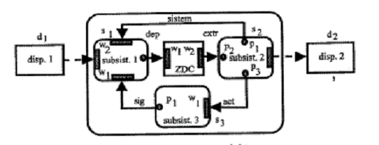 Sistemul reprezentat in figura 9 este descompus intr-un numar de subsisteme (subsist1, subsit2 si subsist3) interconectate intre ele, doua dispozitive (disp1 si disp2) hardware In afara, precum si o zona de date pentru comunicare (ZDC; engt.: Intercommunication Data Areas). Conexiunile sunt numite cai (engl.: path) si arata legaturile dintre porturi si ferestre (engl.: windows). Porturile sunt reprezentate prin cercuri mici umplute, iar ferestrele prin dreptunghiuri mici umplute. Fiecare port indica, pentru subsistemul care fl contine, necesitatea utilizarii unei interfete de acces specifice (acelui port). Fiecare fereastra indica, pentru subsistemul care o contine, ca furnizeaza o interfata de acces specifica (acelei ferestre). Datele pot circula fie de la un port la o fereastra, fie invers, fie in ambele sensuri. Controlul fluxului de date este realizat de portul continut in 'cale', folosind o procedura de interfata si de o fereastra realizand o implementare a interfetei. Astfel, exista notiunea de porturi, reprezentand elemente active, adica capabib sa starteze o interactiune. Ferestreie sunt pasive. Ele nu pot starta operatii de schimb de informatii daca nu exista porturi care sa le solicite. Daca o fereastra este conectata cu trtai multe porturi, atunci interacfiunile se pot suprapune in timp. Aceasta duce la accesul concurent la o components avand o fereastra. Interfata procedurala dintre un port si o fereastra este definita de catre un modul separat numit interfata de acces si de catre proceduri cunoscute ca procedure de acces, in descrierea sistemelor si subsistemelor se utilizeaza sabloane (engl.: template) care precizeaza cum sunt construite acestea. S-a utilizat termenul de sablon in loc de modul pentru a accentua ca este reutilizabil. Unele sabloane sunt unice si sunt utilizate o singura data, in trap ce altele vor fi utilizate to mai multe parti ale sistemului, sau chiar in sisteme diferite. Se adauga module cu specifkatii indicand cum sunt interconectate intre ele subsistemele. Fiecare subsistem din diagrams are doua nume asociate lui. Numele marcat in interior desemneaza tipul sablonului, iar numele marcat in afara precizeaza componenta produsa cu acest tip de sablon. Sablonul defineste porturile, ferestreie si tipurile de interfere de acces asociate care constrang conexiunea astfel incat fiecare port trebuie sa fie conectat cu o fereastra care realizeaza o interfata de acces corespunzatoare.