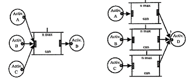Sunt acceptate si alte structuri precum cele din figurile 17 si 18. Desi aceste structuri par a fi echivalente, totusi fntre ele exists o mare diferenta func|:ionala. Daca in cazul din figura 17 activitatea D preia prima data introdusa in canal (indiferent care dintre activitatile A, B sau C au efectuat operatia), pentru figura 18 activitatea D poate alege care dintre canale sa fie utilizat mai intai pentru preluarea unei date, Celelalte date urmeaza s3 fie preluate in secvenfeie ulterioare. Daca datele nu sunt disponibile la un anumit canal, se poate inrautati performanta sistemuiui.