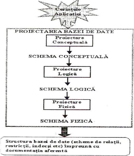 Activitatea de proiectare a bazelor de date se incadreaza in metodologia generala de realizare a sistemelor informatice. Plecand de la existenta celor trei niveluri de organizare a datelor in baze de date, proiectarea strucxturii bazei de date va fi realizata in mod corespunzator celor trei niveluri - conceptual, logic si fizic - parcurgand fazele descrise in figura 6.4.
