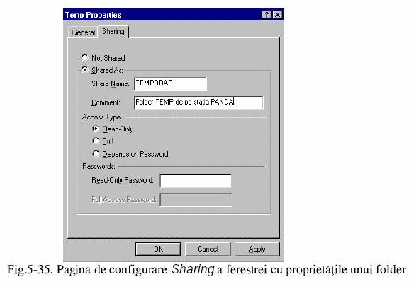 - Numele sub care va fi cunoscut folderul in cadrul retelei (Sharing Name). Aceste nume poate fi diferit de numele real al folderului. Pentru ca sub MS-DOS numele folderului partajat sa fie recunoscut, este necesar ca denumirea sa sa nu depaseasca 8 caractere. Daca in cadrul retelei nu sunt folosite statii de lucru MS-DOS, atunci numele poate depasi 8 caractere. In exemplul de mai sus denumirea folderului partajat in cadrul retelei este TEMPORAR.
