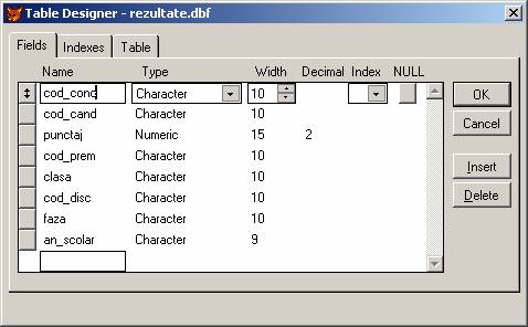 REZULTATE.DBF - pentru evidenta rezultatelor obtinute de elevi: se vor memora codul candidatului, codul concursului la care a participat, punctajul obtinut, codul premiului obtinut, in ce clasa era cand a participat la concurs, in ce an scolar, disciplina concursului si faza (daca este vorba de olimpiada). Pentru o mai buna gestionare a spatiului de memorie am folosit coduri unice pentru fiecare candidat, fiecare disciplina, fiecare disciplina si premiu.