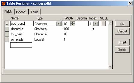 CONCURS.DBF - unde sunt memorate toate concursurile la care participa elevii; pentru o eficienta spatiului de memorare am folosit o baza de date separata, fiecarui concurs fiindu-i atribuit un cod unic; in plus la introducerea rezultatelor nu va fi nevoie sa introducem de fiecare data concursul: el va putea fi preluat automat dintr-o lista care are ca elemente inregistrarile acestei baze de date