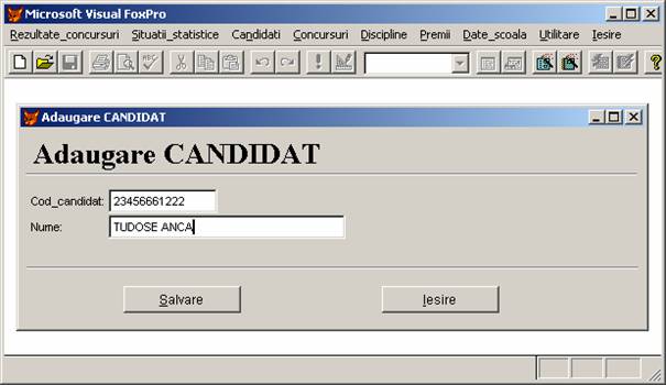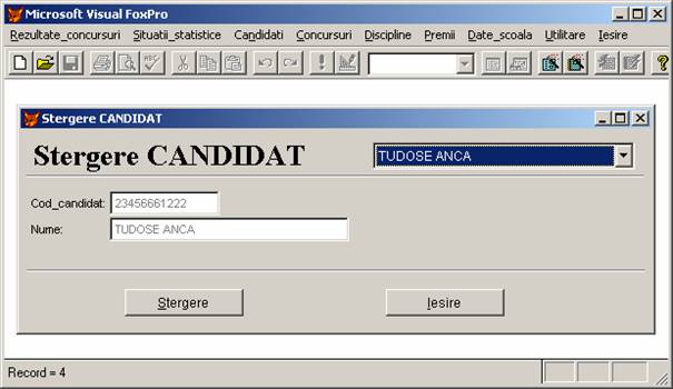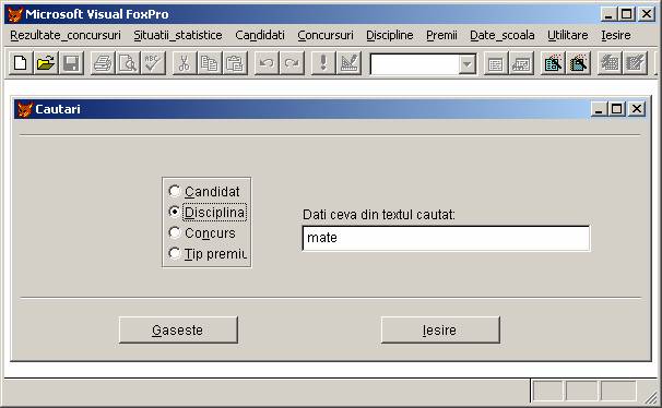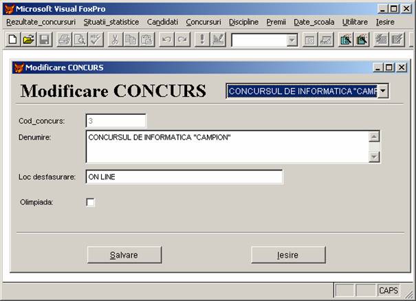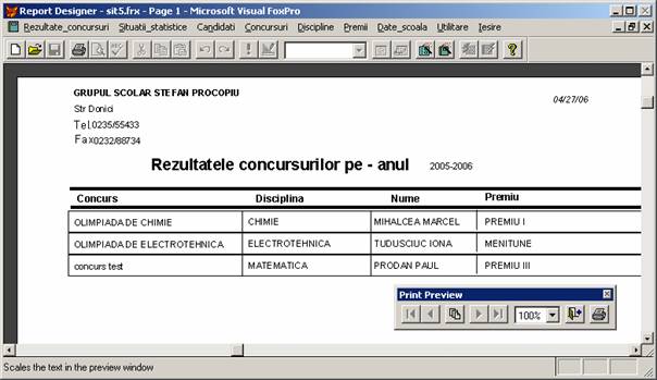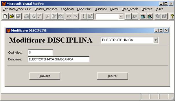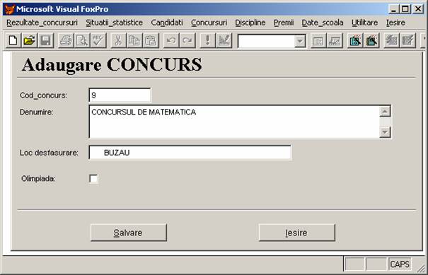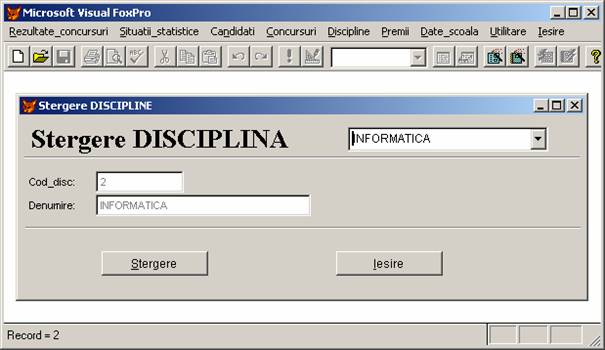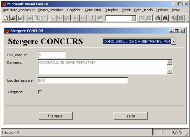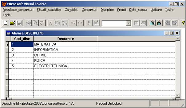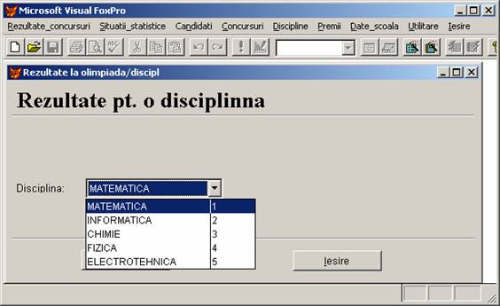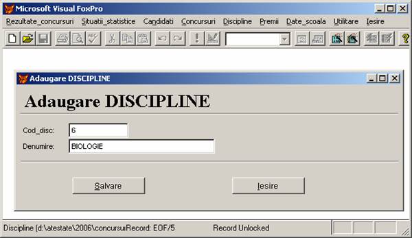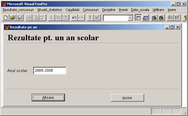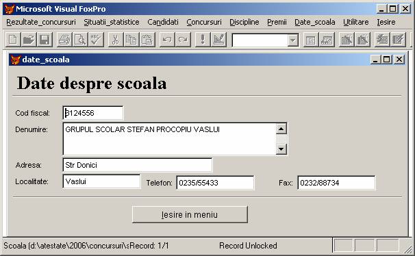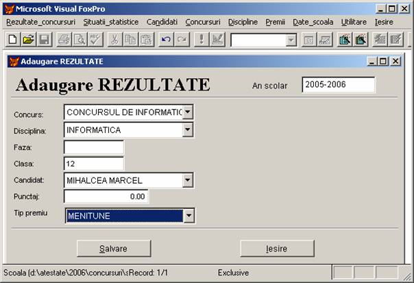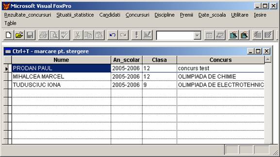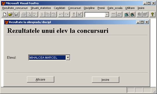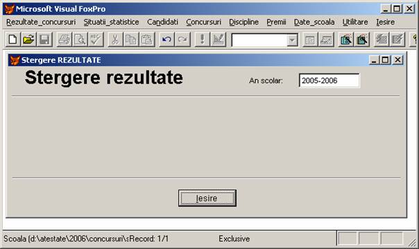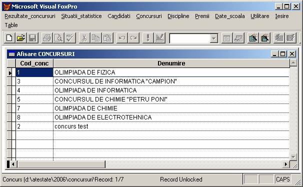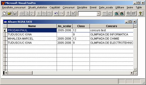 Rezultate concursuri: permite adaugarea, stergerea si afisarea inregistrarilor din baza de date rezultate.dbf care memoreaza rezultatele obtinute de elevi.