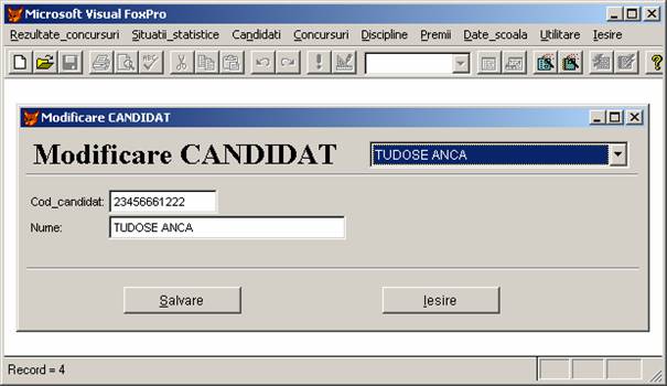 Candidati - este optiunea meniului principal ce va permite adaugarea, stergerea, modificarea si afisarea elevilor.