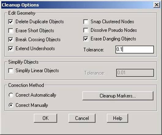 Activam optiunile Delete Duplicate Objects, Break Crossing Objects, Extend Undershoots, Erase Dangling Objects, avand grija sa asignam valoarea in casuta Tolerance de 0.1.