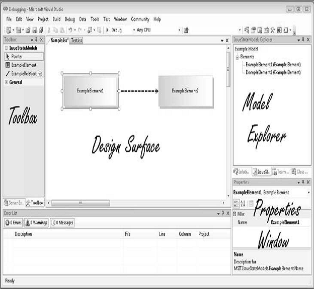 DSL Tools este o abordare grafica pentru constructia de DSL-uri. Cand se creaza un proiect DSL apare un DSL Designer care permite crearea unui editor de diagrame sub forma unui Visual Studio Designer generat, numit Experimental Hive(instanta a metalimbajului specificat- Fig. 2). Acest lucru poate crea confuzii deoarece este folosit un Designer de Designer care va fi folosit pentru crearea unui Designer personalizat care va fi folosit de catre utilizatori la crearea de diagrame si la generarea de cod. In primul Designer va fi specificat tipul diagramelor pe care utilizatorul le poate crea : flow chart, class diagram, workflow diagram. Dupa folosirea DSL Designer-ului pentru a specifica designer-ul personalizat se vor folosi sabloanele standard pentru a genera cod care apoi va fi rulat. Codul generat dupa ce va fi rulat va crea un designer personalizat care va avea un toolbox ce contine entitatiile si relatiile specificate in metamodel si in acest moment se pot creea diagrame de tipul celor specificate in metamodel. Urmatorul pas este adaugarea de sabloane care genereaza cod pe baza diagramelor create in prealabil.