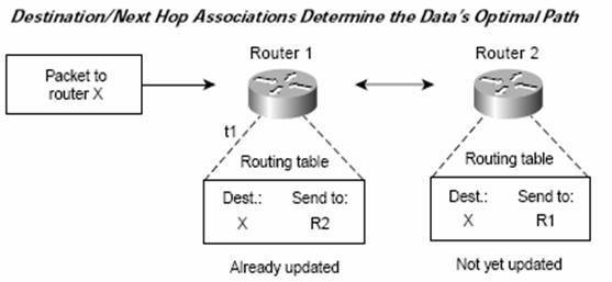 Protocoalele de routare folosesc diferite metrici pentru a evalua ce drum este optim pentru transportul unui pachet. O metrica este o masura standard, ca de exemplu latimea de banda. Pentru determinarea drumului, algoritmii de routare, initializeaza si administreaza tabele de routare, in care se afla informatii despre rute. Informatiile din aceste tabele de routare contin asocieri de destinatii si urmatorul 'hop' ce trebuie parcurs pentru a ajunge la acea destinatie. Cand un router primeste un pachet va incerca sa asocieze adresa destinatie a pachetului cu o adresa a unui hop imediat urmator in calea acelei destinatii, daca nu reuseste probabil va distruge pachetul. In figura de mai jos se observa un scenariu de aflare a urmatorului hop.