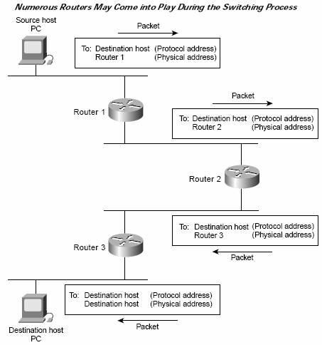 Algoritmii de switching sunt relativ simpli, sunt aceiasi pentru majoritatea protocoalelor de routare. Un host vrea sa trimita un pachet la alt host. Dupa ce obtine adresa unui router, trimite pachetul la adresa fizica (MAC) a routerului respectiv. Routerul verifica adresa protocolului destinatie (diferit de adresa fizica, care se schimba prin fiecare router) si daca cunoaste aceasta adresa, schimba adresa fizica a pachetului cu adresa urmatorului hop si trimite pachetul la acel hop. Un exemplu de switching este in figura urmatoare.