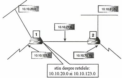 In plus, aceasta ar fi inutila, deoarece Ruterul 2 este si el conectat la aceasta retea si stie deja despre ea. Sa examinam acum esantioane ale tabelelor de rute pentru ruter 1 si ruter 2 rezultate din aceste schimburi (avem in vedere diagrama din Figura 1 si urmatorul esantion de tabel de rutare).