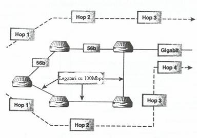 Totusi, modul simplist cu o singura metrica de selectare a caii folosit de RIP, nu asigura intotdeauna cea mai buna ruta la destinatie. De exemplu, sa presupunem ca exista doua rute spre o destinatie (Figura 2). Una dintre cai are lungime de patru hopuri si consta din trei legaturii Ethernet de 100Mbps si o legatura de gigabit. Cealalta cale are lungime de trei hopuri si consta din doua legaturi WAN de 56kbps si o legatura gigabit.