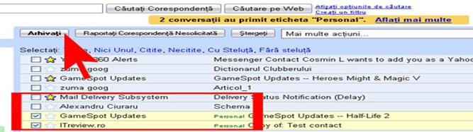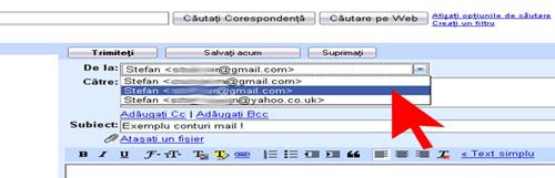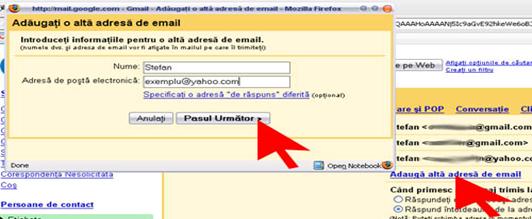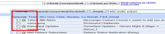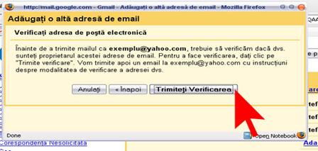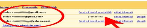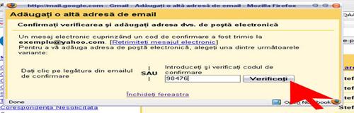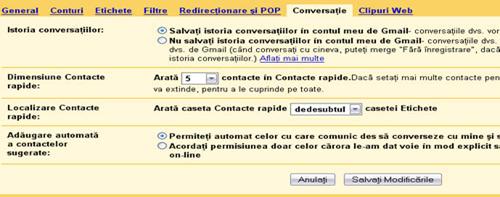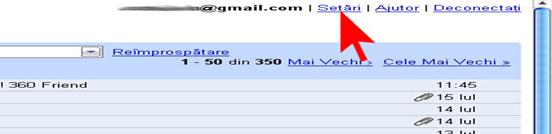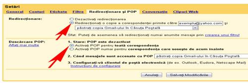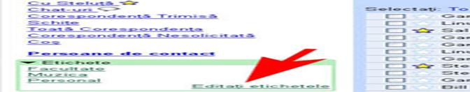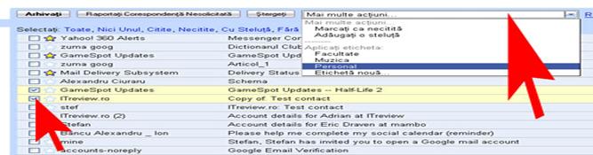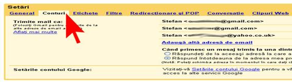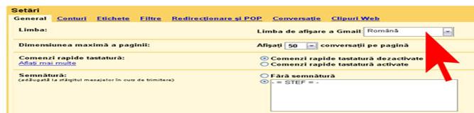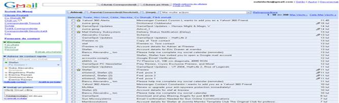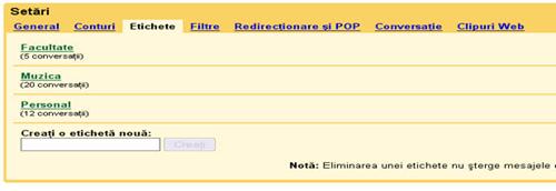 pentru posesorii contului de Gmail sau contului Google. Gmail scaneaza automat fisierele atasate. Google acorda importanta deosebita securitatii mesajelor 5. Prezentarea setarilor Gmail : Interfata Gmail este intuitiva si cu un aspect placut si discret, fara reclame, bannere, pop-up sau alte elemente "de umplutura". In primul rand alegeti limba de la : Settings (dreapta sus) > General > Gmail display language > Romana. In partea de jos a paginii apasati Save Changes. Acum aveti interfata Gmail in limba romana. Gmail ofera cateva elemente care ajuta la notarea mesajelor importante, etichetarea si arhivarea acestora. In primul rand marcarea mesajelor importante cu steluta Vizualizarea tuturor mesajelor cu steluta se face accesand Cu Steluta (stanga sus). A doua metoda de a nota mesajele importante este aplicarea unei etichete. Mai intai se Editeaza etichetele si se creeaza categoriile dorite (Ex: serviciu, office, etc.). Dupa aceasta se aplica eticheta : Daca doriti ca mesajele etichetate sa nu mai apara in Casuta Postala selectati-le si accesati Arhivati Aceste mesaje pot fi vizualizate de la Etichete. Adaugarea contactelor in agenda se face de la Persoane de contact. Pentru modificarea detaliilor unui contact este de ajuns un simpu click pe acesta si puteti modifica datele din formular. Setari conturi : va ajuta sa adaugati adrese de mail (conturi deja existente) si sa selectati adresa de la care raspundeti sau scrieti mesaje, in cazul in care nu doriti ca aceasta sa fie chiar adresa de Gmail curenta ! Pentru aceasta urmati etapele : a) In acest moment la adresa specificata ati primit un mesaj de confirmare si un cod de confirmare. Introduceti acest cod : Acum alegeti adresa prestabilita. De acum inainte, de cate ori scrieti un mesaj aveti posibilitatea sa alegeti adresa de la care scrieti. Setari etichete Setari redirectionare si POP : daca doriti sa redirectionati o copie a mesajelor primite spre alta adresa ; daca doriti sa descarcati mesajele pe HardDisk folosind un client de mail (acesta trebuie instalat si configurat !), selectati Descarcare POP : Setari conversatie : setari pentru conversatiile Google Talk care functioneaza si fara programul instalat, direct din Gmail :