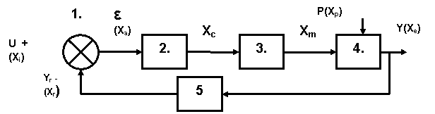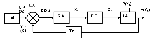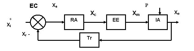 Valoarea prescrisa (dorita) a marimii de iesire Xe se impune prin marimea de intrare Xi. ea se poate modifica printr-o actiune asupra elementului de intrare EI, data de un operator uman sau de un dispozitiv tehnic. Elementul de comparatie EC compara marimea de intrare cu marimea de reactie, dand marimea de actionare Xa=Xi-Xr