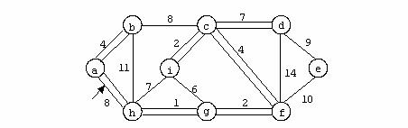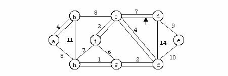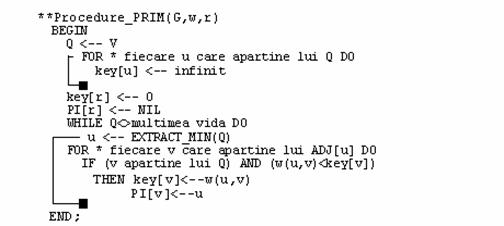 Se considera intai cazul in care se intretine o coada de prioritati Q=VS implementata ca un masiv. Pentru o astfel de implementare, fiecare operatie EXTRACT-MIN consuma un timp O(|V|) si existand cardinal de V de astfel operatii rezulta ca timpul total pentru executia lui EXTRACT-MIN este de ordinul O(|V|2). Fiecare nod vIV este inserat in multimea S exact o data, astfel incat fiecare muchie din lista de adiacenta ADJ(v) este examinata in bucla FOR exact o data, in timpul algoritmului. Deoarece numarul total de muchii din toate listele de adiacenta este egal cu |E| rezulta ca numarul total de iteratii este |E| pentru bucla FOR (fiecare iteratie consumand un timp O(1)).