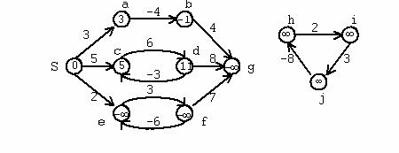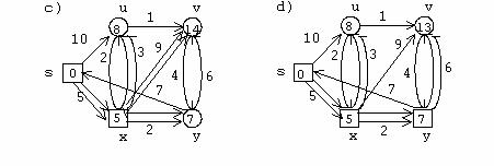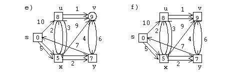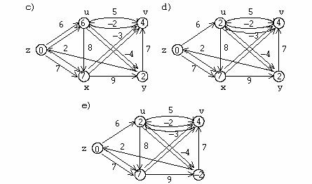 Figura a) prezinta situatia exact inaintea primei treceri executate asupra muchiilor grafului, iar urmatoarele figuri arata transformarile grafului datorita algoritmului BELLMAN-FORD.