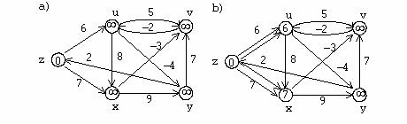 Executia algoritmului BELLMAN-FORD va fi prezentata in urmatoarele figuri[10], si se considera drept nod sursa nodul z, valoarea d este aratata in interiorul fiecarui nod, iar muchiile dublate indica valorile PI. In cazul particular al exemplului, fiecare trecere realizeaza relaxarea muchiilor in ordine lexicografica, adica in ordinea: (u,v); (u,x); (u,y); (v,u); (x,v); (x,y); (y,v); (y,z); (z,u); (z,x).
