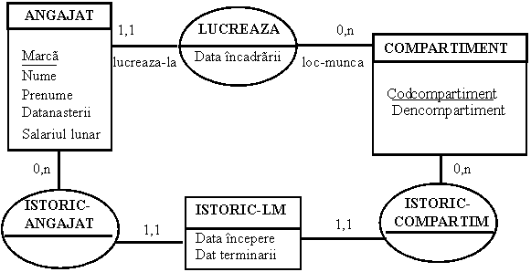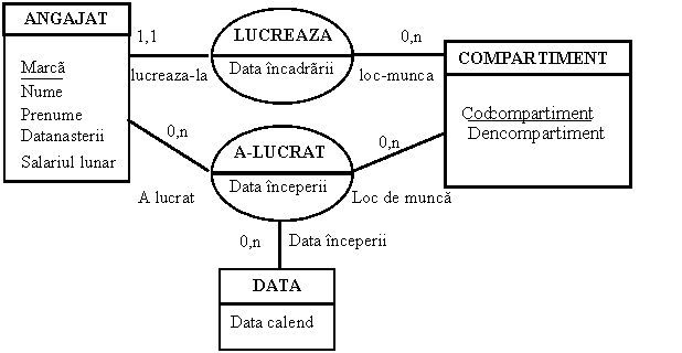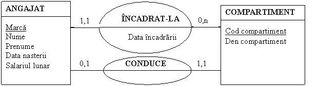 ANGAJAT(Marca,Nume, Prenume, Data nasterii, Salariul lunar, Cod compartiment*, Data incadrarii)