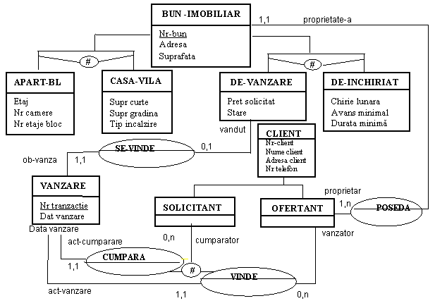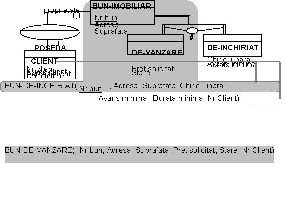 BUN-IMOBILIAR(Nr bun, Adresa, Suprafata, Pret solicitat, Stare, Chirie lunara, Avans minimal, Durata minima, Nr client*)