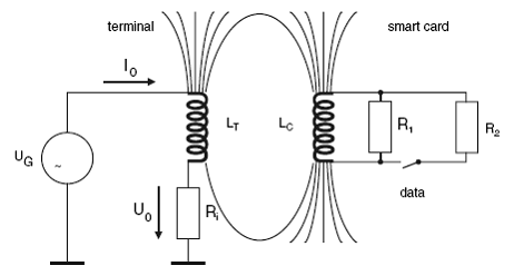 Principiul functionarii se bazeaza pe pierderile cuplajului transformatorului .Un camp magnetic de frecventa inalta este generat de o bobina din interiorul terminalului cu scopul de a transfera energie.Cele mai folosite frecvente sunt 125kHz si 156MHz ce corespund unor lungimi de unda de 2400m, respectiv 22m.Lungimile de unda ale campului electromagnetic sunt de cateva ori mai mari decat distanta de la terminal la card, ceea ce inseamna ca acesta trebuie sa se situeze in apropierea terminalului.Astfel poate fi aplicat modelul pierderilor cuplajului transformatorului.Daca un card fara contact este adus in apropierea terminalului, o parte din campul magnetic generat de acesta va trece prin bobina din card si va induce o tensiune Ui. Aceasta tensiune are scopul de a furniza energie cipului.Cum cuplajul intre cele doua bobine este mic, eficienta metodei este scazuta.Un curent mai mare este deci necesar prin bobina din terminal pentru a atinge un nivel ridicat al puterii campului.Acesta se obtine prin conectarea in paralel a unui condensator Ct cu bobina Lt, cu o valoare a capacitatii aleasa astfel incat bobina si condensatorul sa formeze o retea de rezonanta paralel a carei frecventa de rezonanta coincide cu frecventa semnalului de transfer.