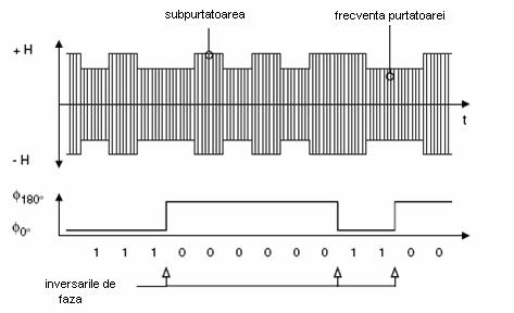 Fig.11 Principiul de functionare al modulatiei de faza pentru transmisia de date pentru smart card-uri fara contact. Graficul de mai sus indica campul magnetic alternativ si starile de faza asociate.Frecventa purtatoarei este 4.9152 MHz, iar a subpurtatoarei e 307.2kHz