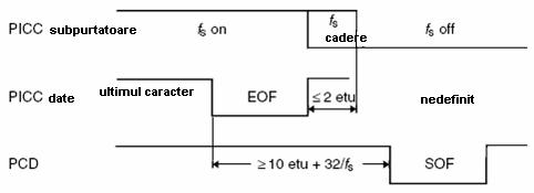 Cadrul EOF incepe de asemenea cu un impuls descrescator, urmat de 10 etu de 0 logic si un impuls crescator in timpul celui de al 11 lea etu.Pentru a preveni protocolul de transmisie de o'strangulare' in cazul unei erori, si pentru a oferi cardului timpii minimi si maximi pentru activitatile interne, timpii dintre doua secvente transmise in directii opuse sunt specificati in standard.Dupa ce cardul a recunoscut cadrul EOF transmisa de terminal, el asteapta o perioada de 'guard time' (TR0) inainte sa genereze subpurtatoarea nemodulata.Dupa asteptarea timpului de sincronizare(TR1), cardul incepe sa demoduleze subpurtatoarea.Valoarea minima pentru TR0 este 64/fS, in timp ce valoarea maxima intr-un salt anticoliziune(pentru un ATQB) este 256/ fS.