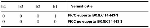 Campul Protocol_Type indica daca un card poate suporta protocolul de transmisie ISO/IEC 14 443-4.Codarea acestui camp este aratata in tabelul urmator: