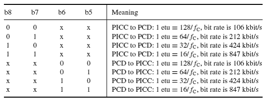 'The lower nibble' al Parametrului 2(bitii b4-b1) specifica marimea maxima a secventei care poate fi receptionata de terminal.'The upper nibble' este folosit pentru a selecta vitezele de bit in ambele directii.Terminalul poate face aceasta optiune, devreme ce el cunoaste deja vitezele de bit suportate de card dinspre terminal.