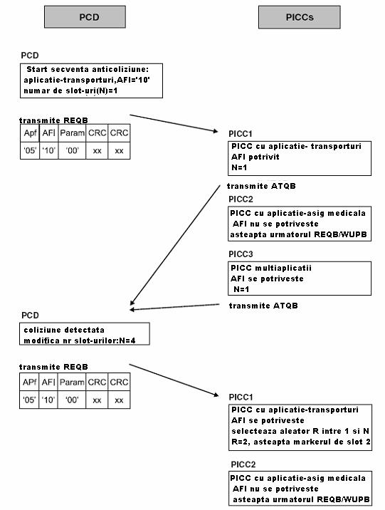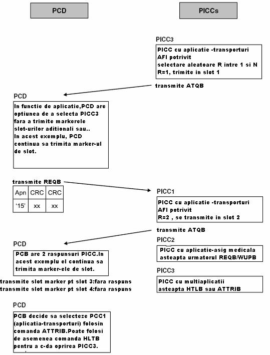 Dupa ce cardul a primit o comanda valida REQB, el verifica daca poate suporta aplicatiile identificate de AFI..Daca poate, evalueaza byte-ul PARAM cu scopul de a obtine valoarea lui N, care specifica numarul de sloturi de timp disponibile. Daca N=1, cardul transmite un ATQB(Answer to Request, Tip-B) si comuta in starea 'Ready Declared'.Daca N>1, cardul genereaza un numar aleatoriu R cu o distributie uniforma intre 1 si N.Daca R=1, cardul transmite un ATQB si comuta in starea 'Ready Declared'.Daca R>1, doua optiuni diferite sunt prevazute in standard cu scopul de a suporta doi algoritmi diferiti: