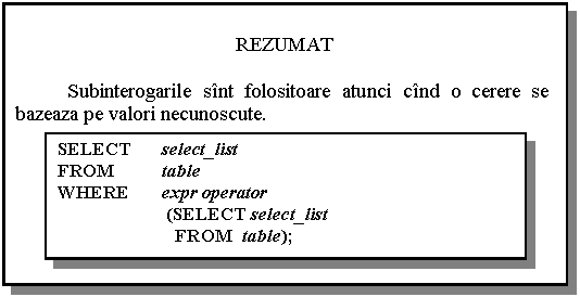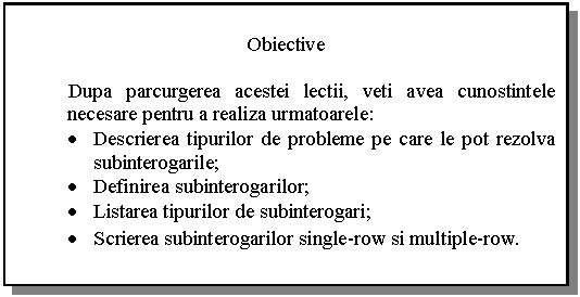 In aceasta lectie se vor studia caracteristici mai avansate ale instructiunii SELECT. Se pot scrie subinterogari in clauza WHERE a altei instructiuni SQL in scopul obtinerii de valori bazate pe o valoare necunoscuta a unei conditii. Aceasta lectie acopera atit subinterogarile single-row, cit si cele multiple-row.