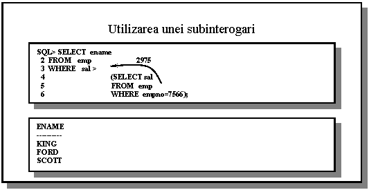 In figura anterioara, cererea interna determina salariul angajatului cu numarul 7566. Cererea externa preia rezultatul cererii interne si il foloseste pentru a afisa toti angajatii care cistiga un salariu mai amre decit aceasta suma.
