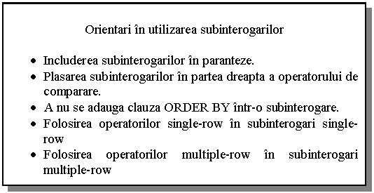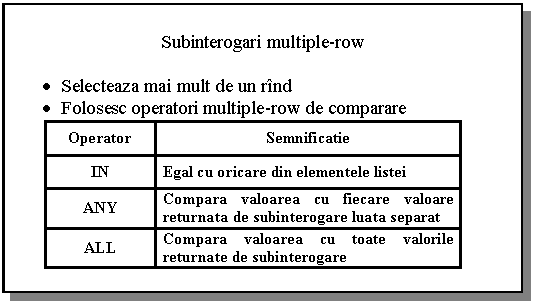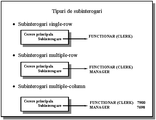 Subinterogarile folosesc doua clase de operatori de comparare: operatori single-row si operatori multiple-row.