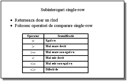 O subinterogare single-row este acea subinterogare care returneaza un singur rind din instructiunea SELECT interna. Acest tip de subinterogare foloseste un operator single-row. Figura anterioara prezinta lista operatorilor single-row.