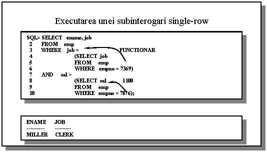 Ambele cereri interne returneaza valori singulare (FUNCTIONAR si 1100), astfel ca aceasta instructiune SQL este denumita o subinterogare single-row.