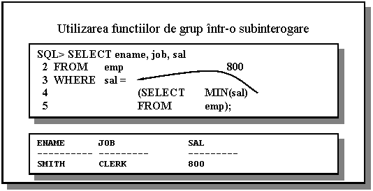 Exemplul din figura precedenta afiseaza numele, postul si salariul tuturor angajatilor al caror salariu este egal cu salariul minim. Functia MIN (functie de grup) returneaza o singura valoare (si anume, 800), care este folosita de catre interogarea principala.