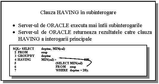 Subinterogarile pot fi folosite nu numai in clauza WHERE, dar si in clauza HAVING. Server-ul de Oracle executa subinterogarea, returnind apoi rezultatul catre clauza HAVING a subinterogarii principale.