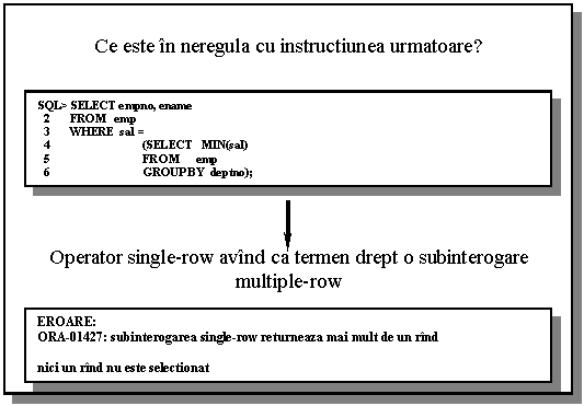 O eroare obisnuita la folosirea subinterogarilor o reprezinta returnarea a mai mult de un rind de catre o subinterogare dorita a fi de tip single-row.