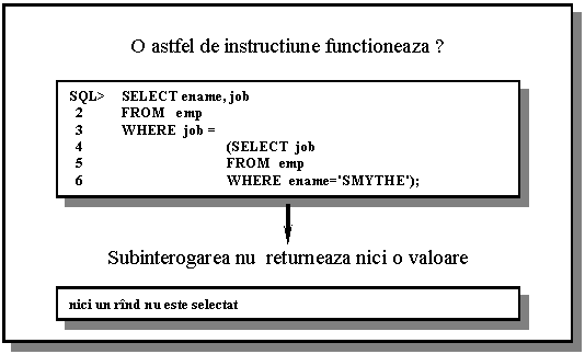 In ceea ce priveste instructiunea SQL de mai sus, subinterogarea contine o clauza WHERE (ename = 'SMYTHE'). Se presupune ca intentia este de a selecta angajatul cu numele Smythe. Instructiunea pare a fi corecta, dar la executie nu se selecteaza nici un rind.
