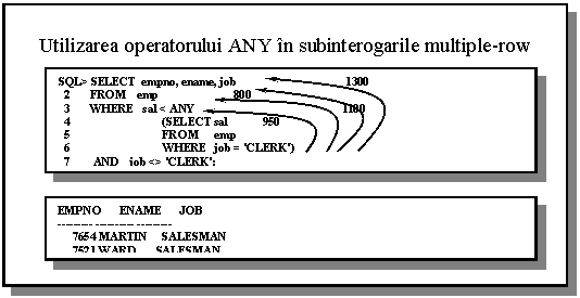 Operatorul ANY (si operatorul SOME, sinonim acestuia) compara o valoare cu fiecare valoare returnata de subinterogare. Exemplul de mai sus afiseaza angajatii ale caror salarii sint mai mici decit al oricarui functionar (clerk) si care nu sint functionari. Salariul maxim pa care il cistiga un functionar este 1300. Instructiunea SQL afiseaza toti angajatii care nu sint functionari, dar cistiga mai putin de
