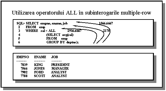 In instructiunea SQL din exemplul anterior, subinterogarea contine o clauza GROUP BY - dupa numarul departamentului (deptno), care implica selectarea mai multor rinduri, cite unul pentru fiecare grup gasit. In acest caz, rezultatul subinterogarii va consta di valorile 800, 1300 si, respectiv 950.