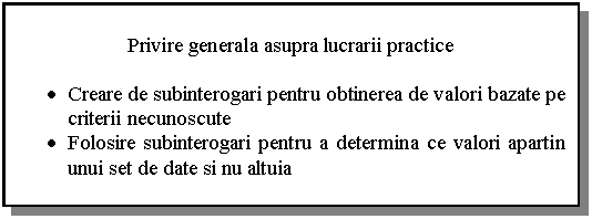 In aceasta lucrare practica se vor scrie interogari complexe folosind instructiuni SELECT incluse.