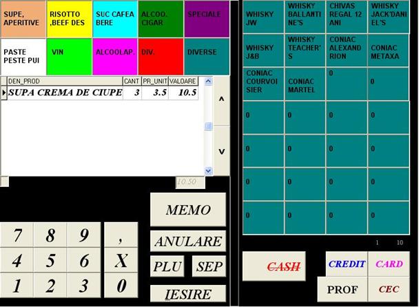 In fereastra de vanzare a programului aceste 10 butoane cu denumirile alese vor aparea in partea de sus a ecranului in stanga, la apasarea unui buton vor aparea 28 de produse in partea din dreapta ( 4X7 butoane ) cu aceeashi culoare care a fost aleasa la categoria respectiva. Pe aceste 28 de butoane se pot aloca codurile produselor ce se doresc sa apara la alegerea categoriei.
