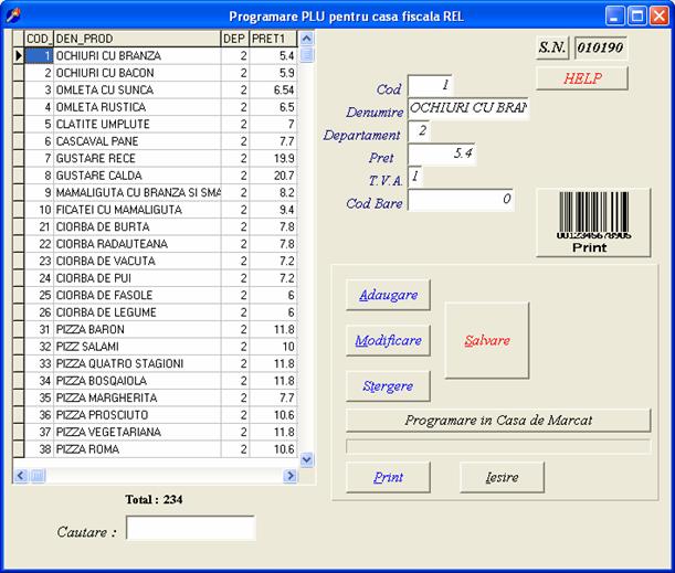 In aceasta fereastra se introduc produsele supuse vanzarii, campurile fiind aceleasi cu cele prezente in casa de marcat, respectiv COD, DENUMIRE, DEPARTAMENT, PRET, COTA TVA( numarul cotei ).Introducerea se face prin apasarea butonului 'Adaugare' dupa care se completeaza campurile date mai sus, codul generat nu este recomandat sa fie modificat pentru a nu aparea coduri duble. Dupa ce se completeaza toate campurile, denumire (max. 40 caractere ), departamentul ( ex. 1-bar, 2-bucatarie ), pretul, se apasa "Salvare" pentru a fi adaugat in baza de date. In caz ca se observa neconcordante se poate apasa "Modificare" si se pot modifica oricare din datele produsului dupa care se da din nou "Salvare".