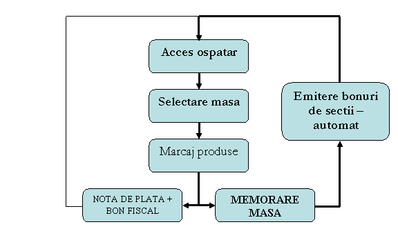 Dupa marcajul produselor se poate memora (butonul MEMO) masa respectiva si aceasta va aparea ocupata de catre ospatar sau se poate inchide si scoate nota de plata + bonul fiscal prin apasarea unuia din butoanele de plata din dreapta-jos. Proforma va emite o nota de plata informativa care nu inchide masa, fiind folosita in general pt. a stabili clientul forma de plata preferata ori suma de plata.