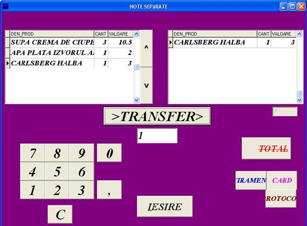In tabelul din stanga se vor afla produsele existente pe masa respectiva din care se vor selecta produsele care vor fi transferate pe nota de plata. In cazul in care se doreste transeferul intregii cantitati se selecteaza produsul si se apasa butonul TRANSFER, daca se doreste alta cantitate (obligatoriu mai mica) se formeaza cantitatea din butoanele de jos dupa care se apasa transfer, pe masa ramanand memorat restul cantitatii.