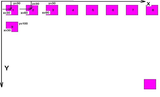 Numarul maxim de mese permise este de 40, acestea vor fi ashezate in coordonatele X-Y puse pentru fiecare masa, coordonata 0-0 este in coltzul din stanga-sus, pe orizontal (X) valoarea maxima este 750 iar pe verticala (y) valoarea maxima este 550. In desenul urmator este exemplificata asezarea a cateva mese avand in dreptul fiecareia trecute coordonatele X-Y :