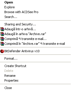 Optiunile din meniul File depind de elementul selectat. In cazul in care este selectat icon-ul unei unitati de hard-disk meniul poate arata ca in figura urmatoare.
