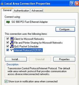 Aici putem verifica sau modifica driverul de placa si protocoalele de retea. Putem adauga protocoale noi prin butonul Install, sau putem dezinstala protocoalele nefolosite sau putem accesa setarile corespunzatoare obiectelor selectate prin butonul Properties. Daca dorim sa configuram protocolul TCP-IP selectam din lista Internet Protocol, si apasam butonul Properties. Pe fereastra de dialog ce apare trebuie sa setam adresa IP prin care se va identifica calculatorul in retea. Putem folosi adrese fixe sau putem solicita "inchirierea " unei adrese de la un furnizor (DHCP). Daca configuram adresa fixa trebuie sa avem grija de unicitatea adresei. Adresa este formata dintr-un grup de 4 cifre de la 0 la 255, ce se desparte in doua parti printr-o masca.