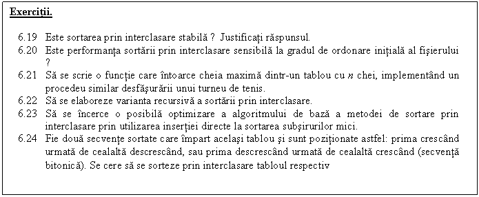 Algoritmul se poate imbunatati ca sa foloseasca doar min(dimA, dimB) locatii in plus. Presupunem dimA = n, dimB = m si n³m. Alocam pentru A un numar de n + m locatii, sursa din A ordonata crescator de la A[n] la A[1], si punem rezultatul interclasarii in capatul liber al lui A (deoarece A are loc pentru cele m componente ale lui B). La mutari de elemente din A, se mai elibereaza locatii. Destinatia este A, ordonata de la A[n+m] la A[1].