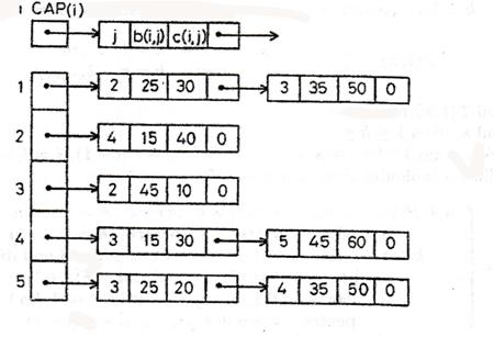 un camp pentru memorarea pointerului care indica legatura la urmatoarea locatie si eventual un camp sau doua campuri pentru b(i, j) sau / si c(i, j). Daca locatia este ultima din lista inlantuita atunci prin conventie in campul pointerului punem valoarea 0. Deoarece avem n liste, una pentru fiecare nod i cu