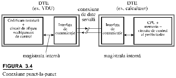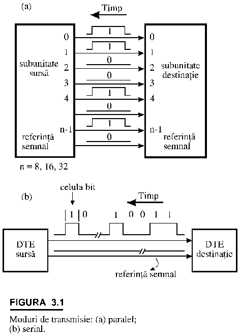 Asa cum s‑a aratat, intre doua DTE datele sunt transmise serial (elemente de cate 8 biti) folosind fie modul sincron fie pe cel asincron (figura 3.4). In interiorul DTE fiecare element este memorat si transferat intr‑o forma paralela. Din acest motiv circuitele de control al transmisiei din cadrul fiecarui DTE ce reprezinta de fapt interfata intre DTE si legatura seriala trebuie sa realizeze urmatoarele functii: